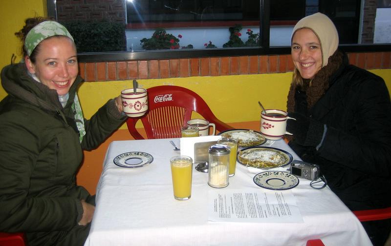 Erin and Fiona with our 7am morning breakfast for $1.50 - coffee, fresh squeezed orange juice, bread, and the breakfast plate of your choice!! I loved it!
