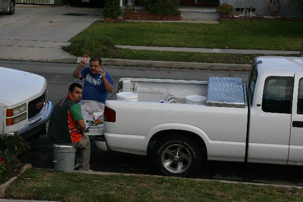 Goodbye sink! The man in the red shirt is the head carpenter.